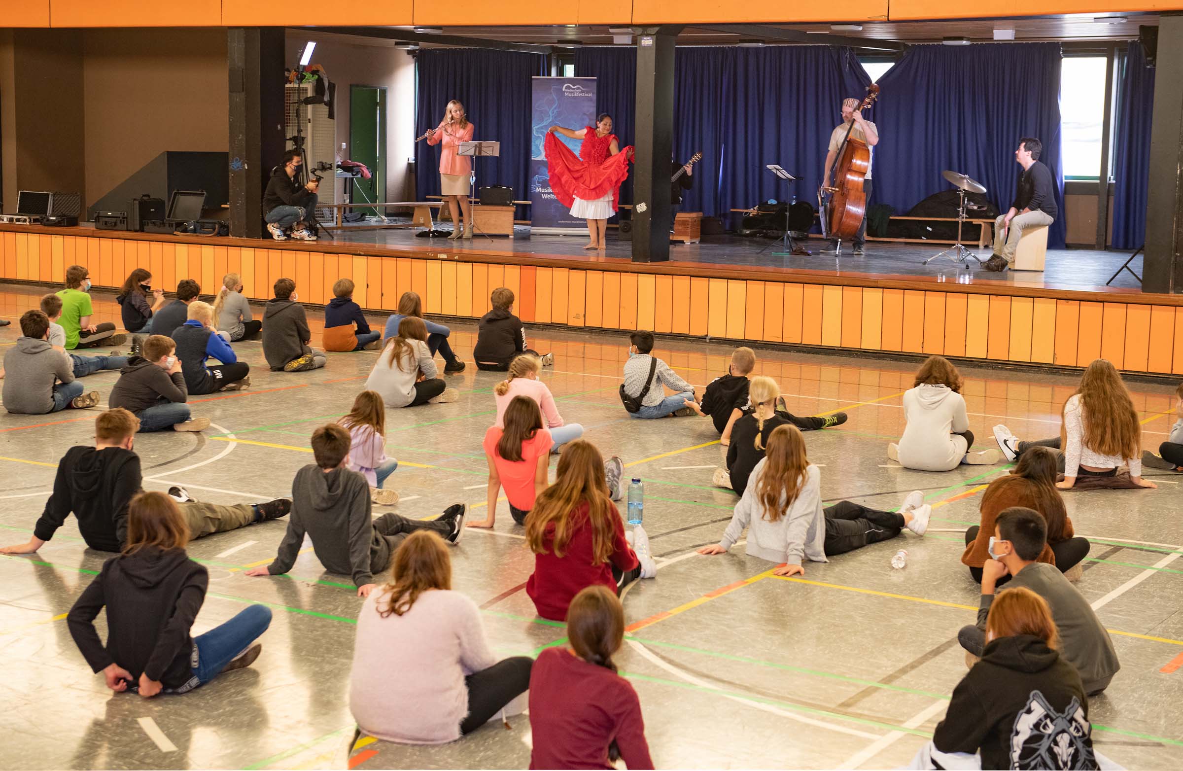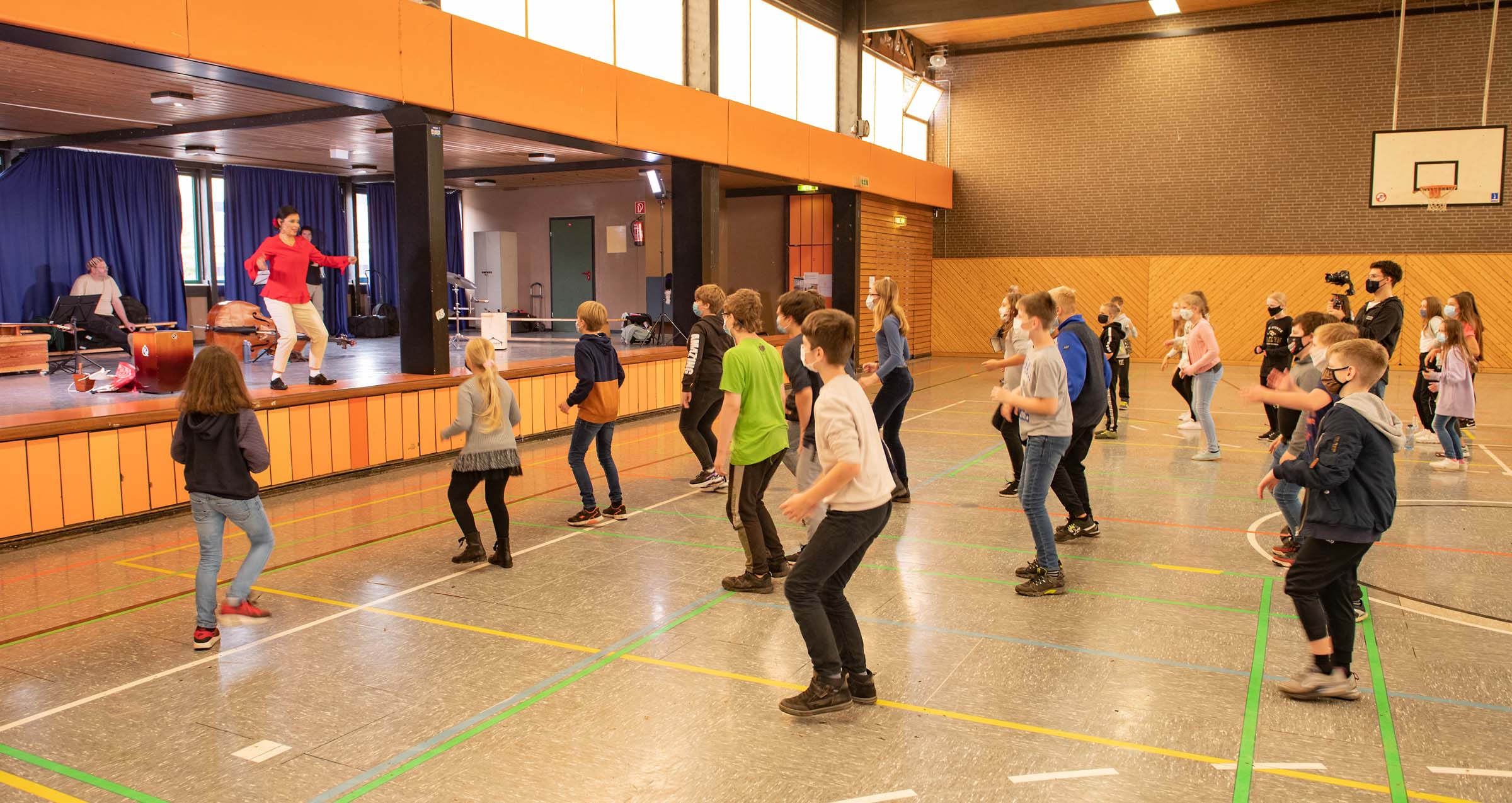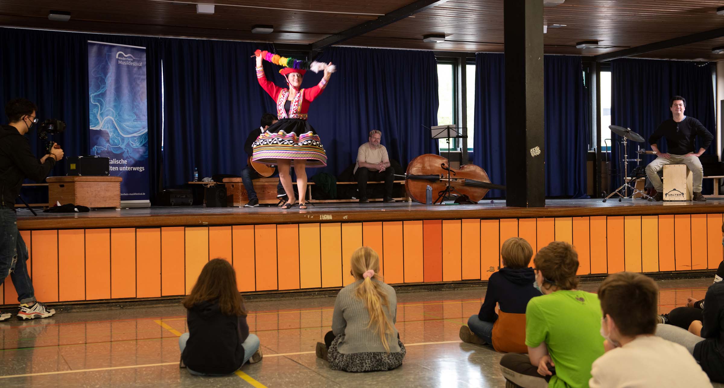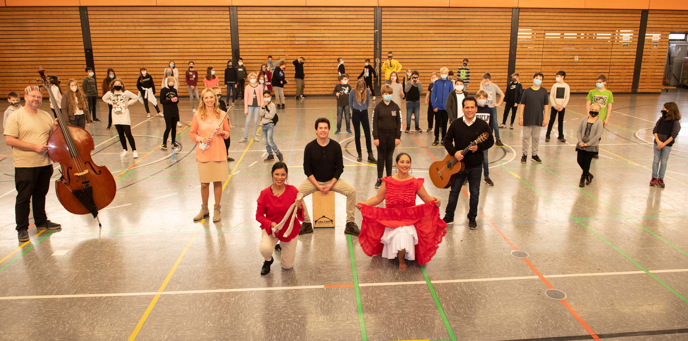 Fotos vom Workshop „Songs around the World – Peru“ in der Gesamtschule Jüchen. (Fotos: Emil Zander) Spielerisch leitete der Workshop Schülerinnen und Schüler an, sich mittels Tanz und Bodypercussion der Musik Perus zu nähern. Zusammen mit den Dozenten – Musikerinnen und Musiker sowie die peruanischen Tänzerinnen und -pädagoginnen Kathy Molina und Alfa Otto – erlebten die Kinder, wie durch Bewegung und Rhythmus die Musik Perus lebendig wird.
